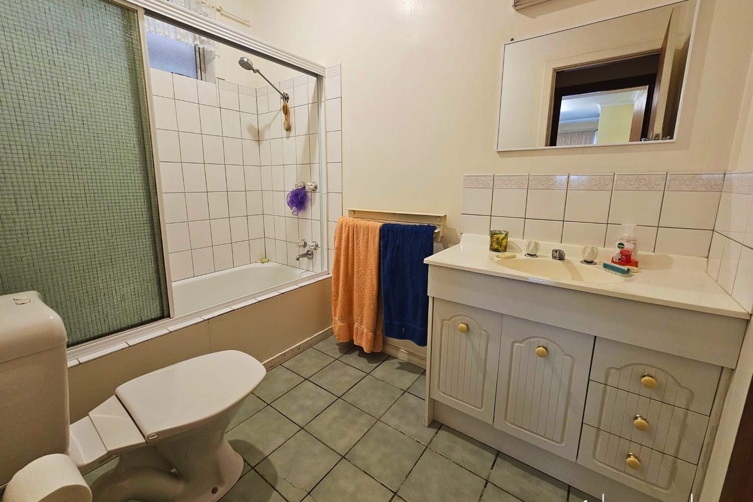 The centrally located bathroom features a vanity & basin, a shower/bath combo, and a toilet that serves the home well.