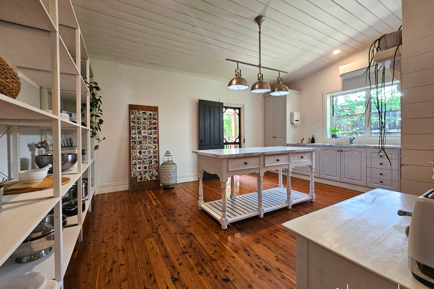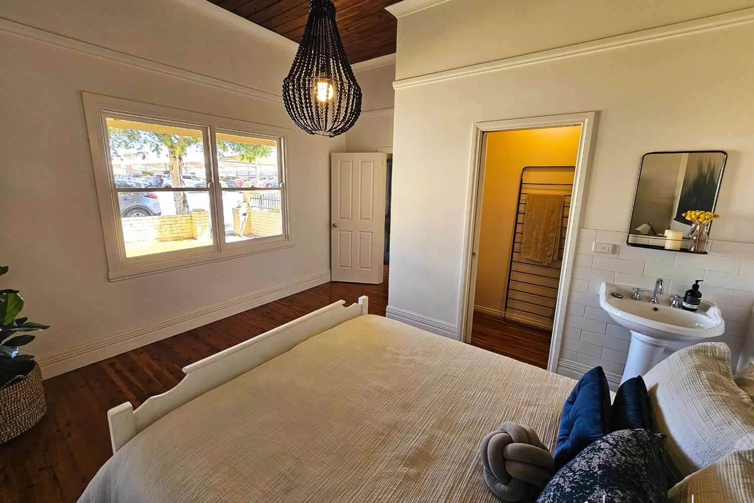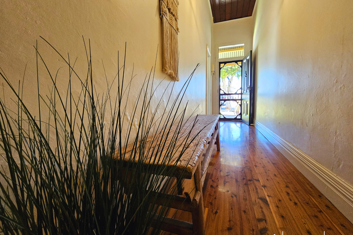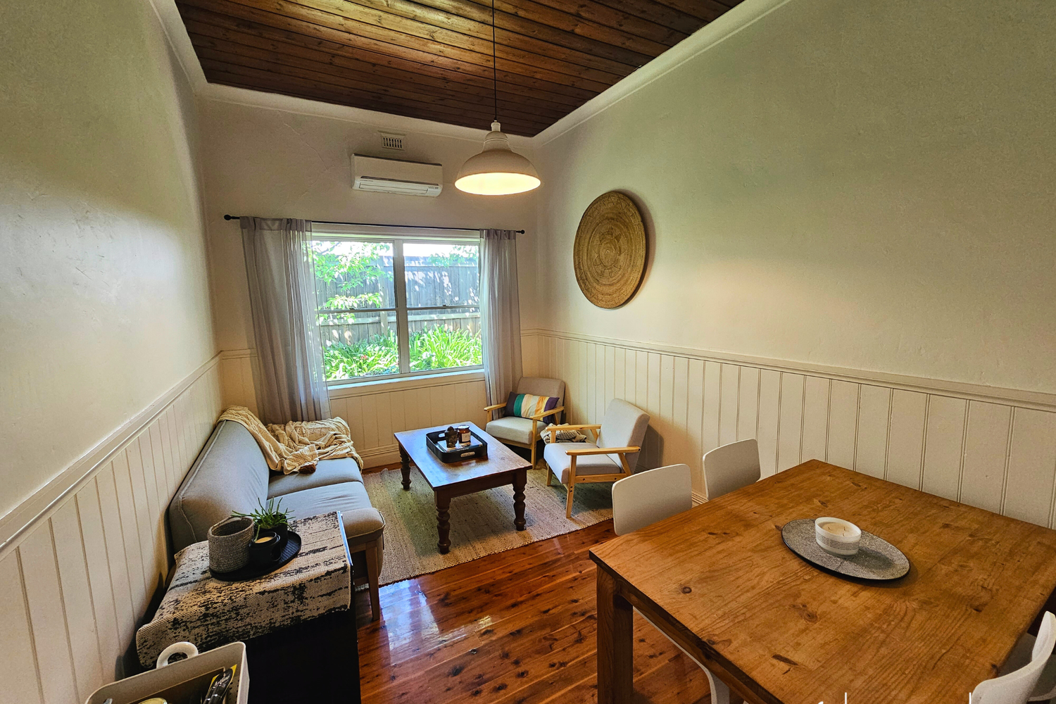 As you enter, you'll be captivated by the stunning Cyprus pine flooring that flows throughout the home, exuding a timeless appeal while the pine-lined ceilings also add a touch of style and character to every room.