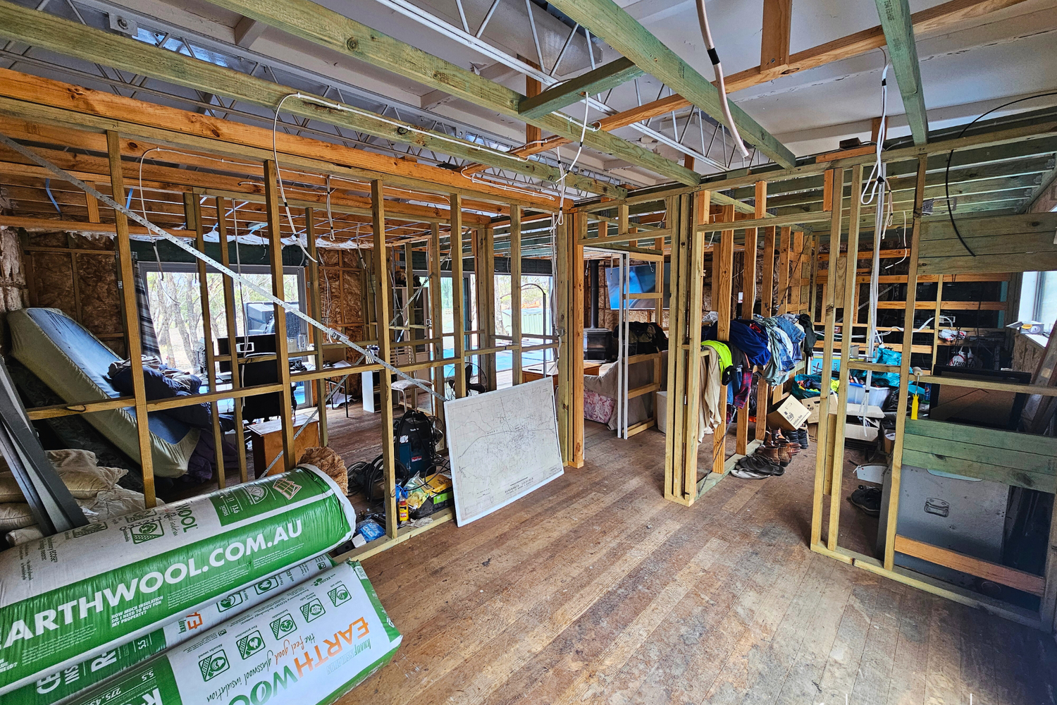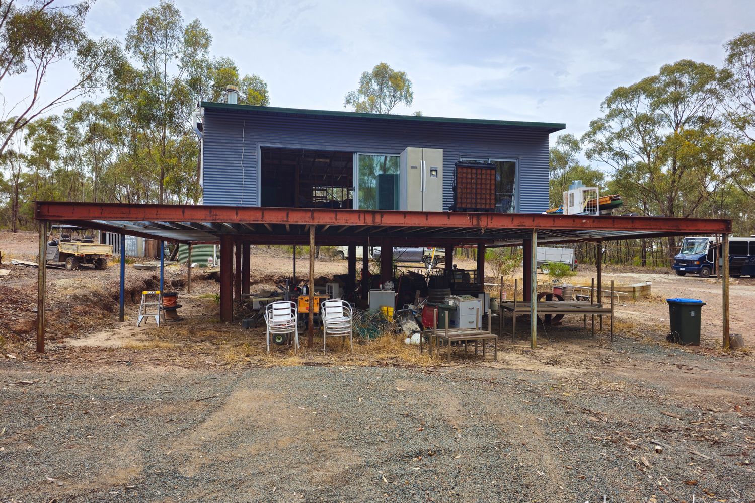 The heart of Wallaby Ridge is a partially constructed two-bedroom dwelling/weekender, elevated off the ground to provide a 360-degree view of the native bush landscape. The open-plan layout, kitchen, and two bedrooms, one featuring an ensuite, are all framed, with wiring and plumbing roughed in and ready for your finishing touches.