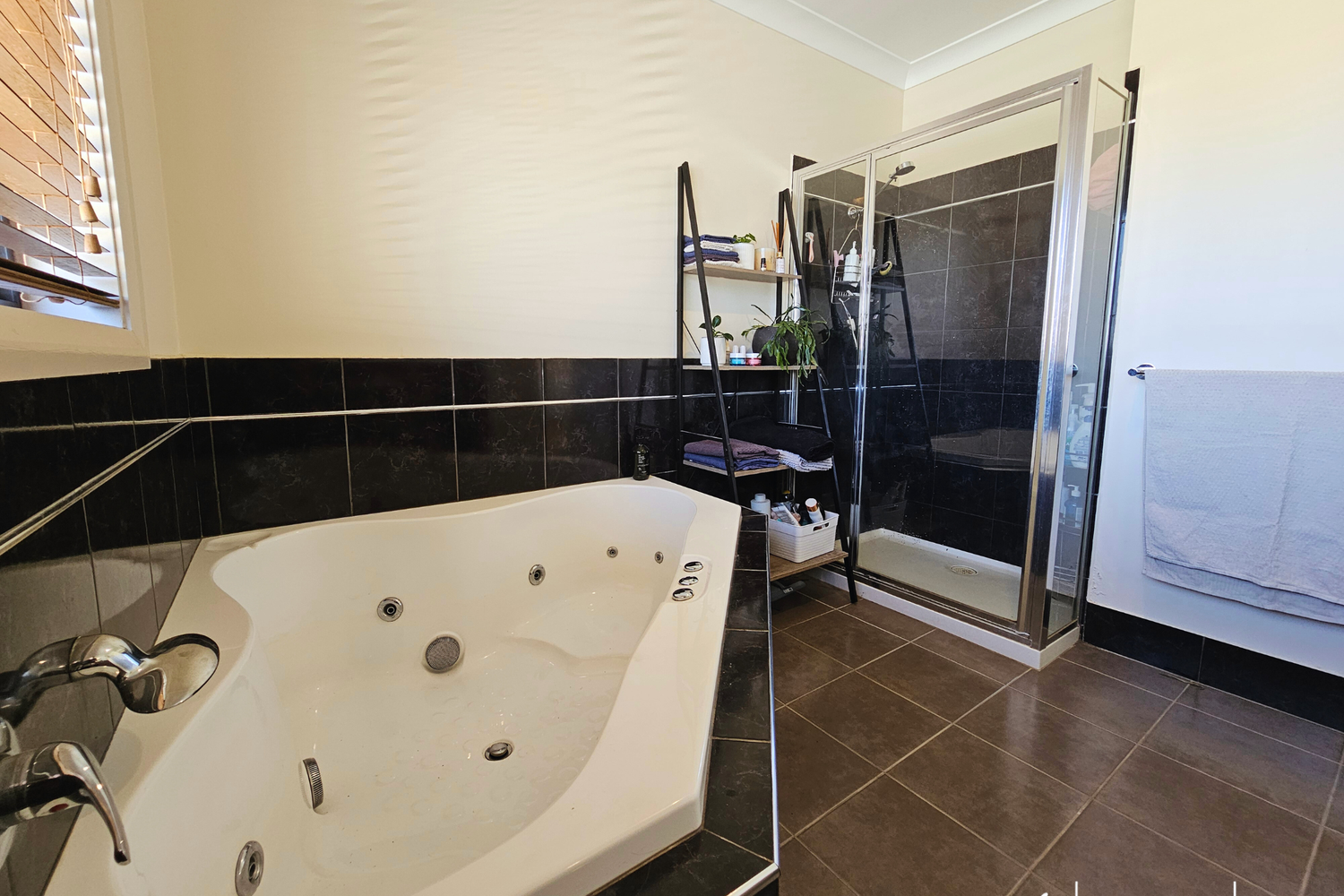 Unwind in the spacious bathroom, featuring a large shower and a luxurious corner spa, offering a tranquil retreat within the comforts of your own home.