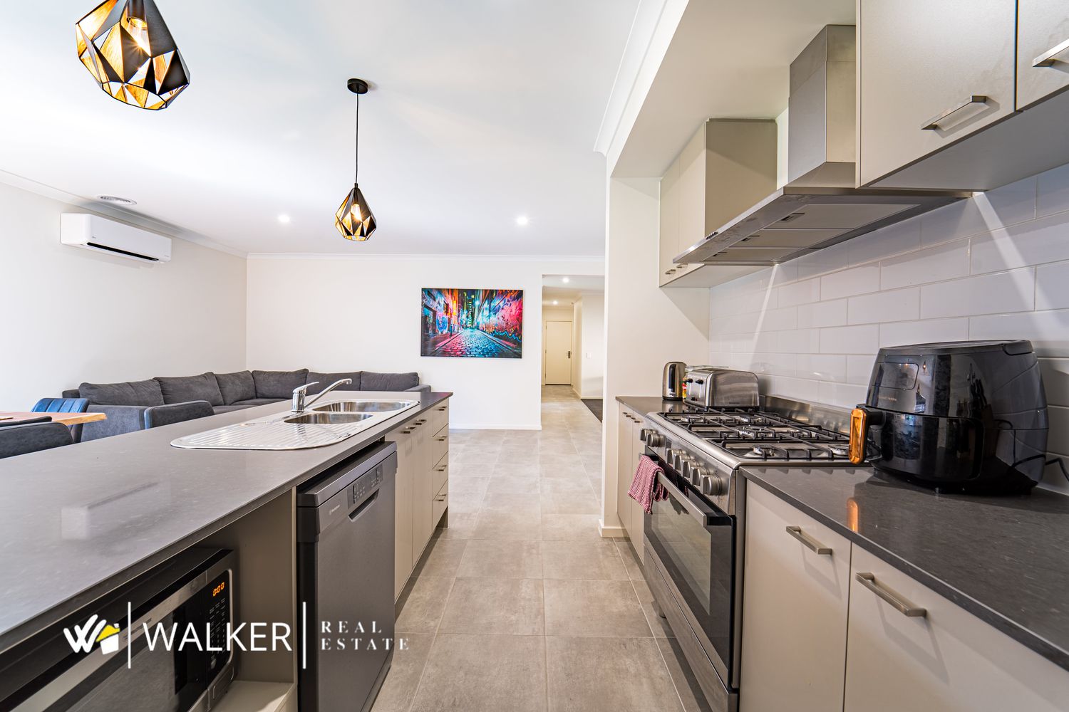 As you step inside, you'll be greeted by an inviting open plan design with 2 separate living areas, perfect for relaxation and/or entertaining. The heart of the home, the stunning kitchen, featuring a 900mm wide Duel Fuel Stove, stone benchtops, and exquisite pendant lighting, creating a space that's both functional and beautiful.