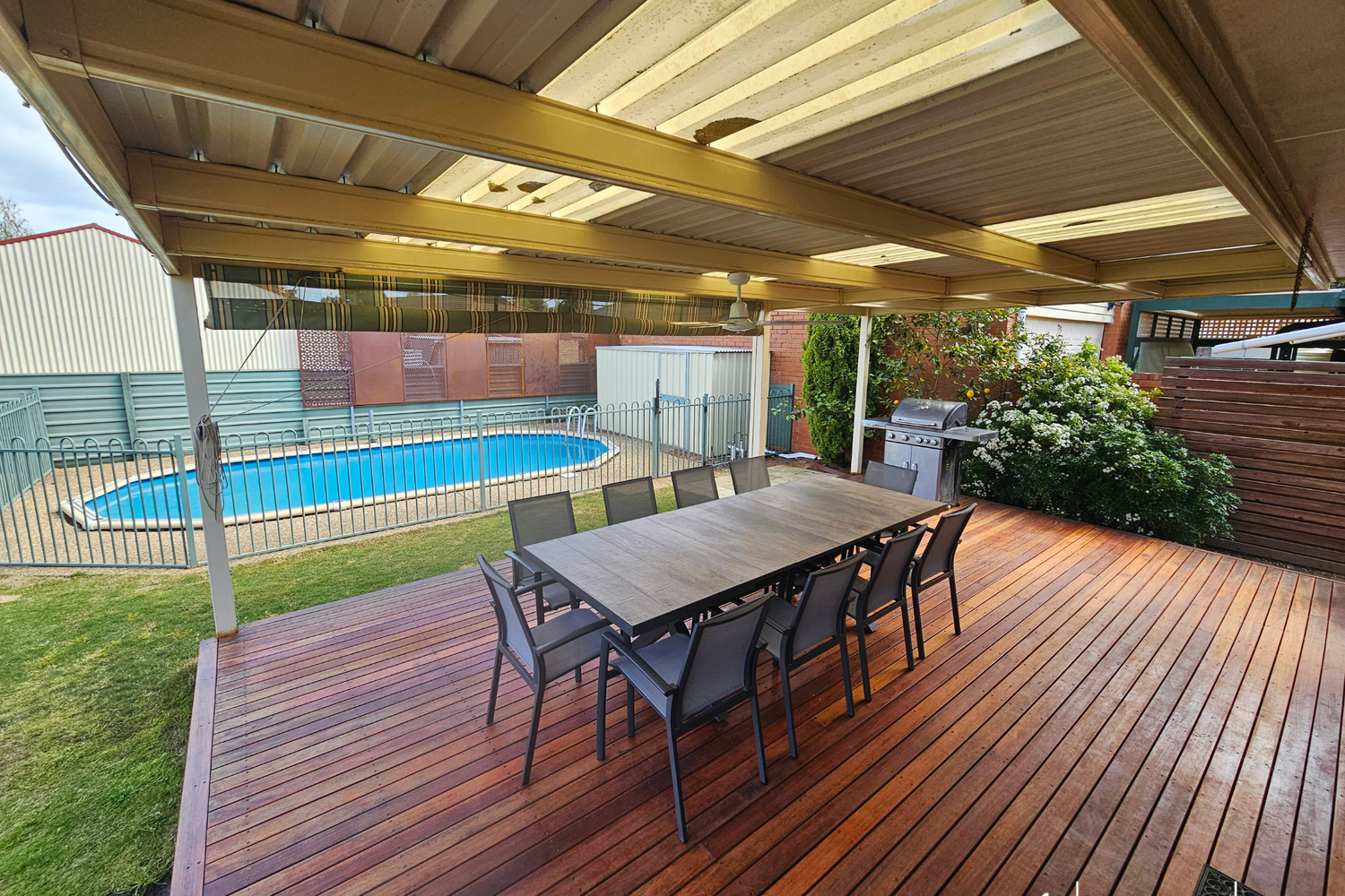 Step outside to a large decked entertaining area, perfect for summer barbecues and lazy afternoons by the pool. Enjoy the flexibility of the Solar Heated above-ground/in-ground swimming pool, providing a refreshing escape right in your backyard.