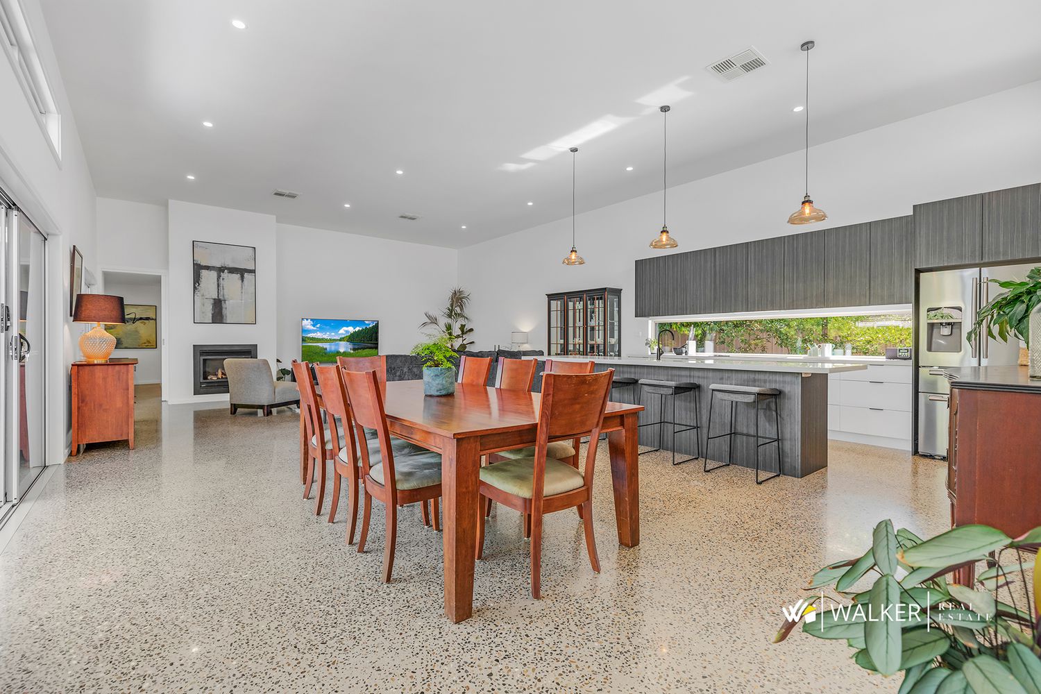 Upon entering, you’ll be captivated by the expansive 88m² lounge, dining, and kitchen area, accentuated by a remarkable 3.6m ceiling height and polished concrete floors. This open-plan space is perfect for both relaxation and entertaining, featuring a cozy gas log heater that adds warmth and charm to your gatherings.