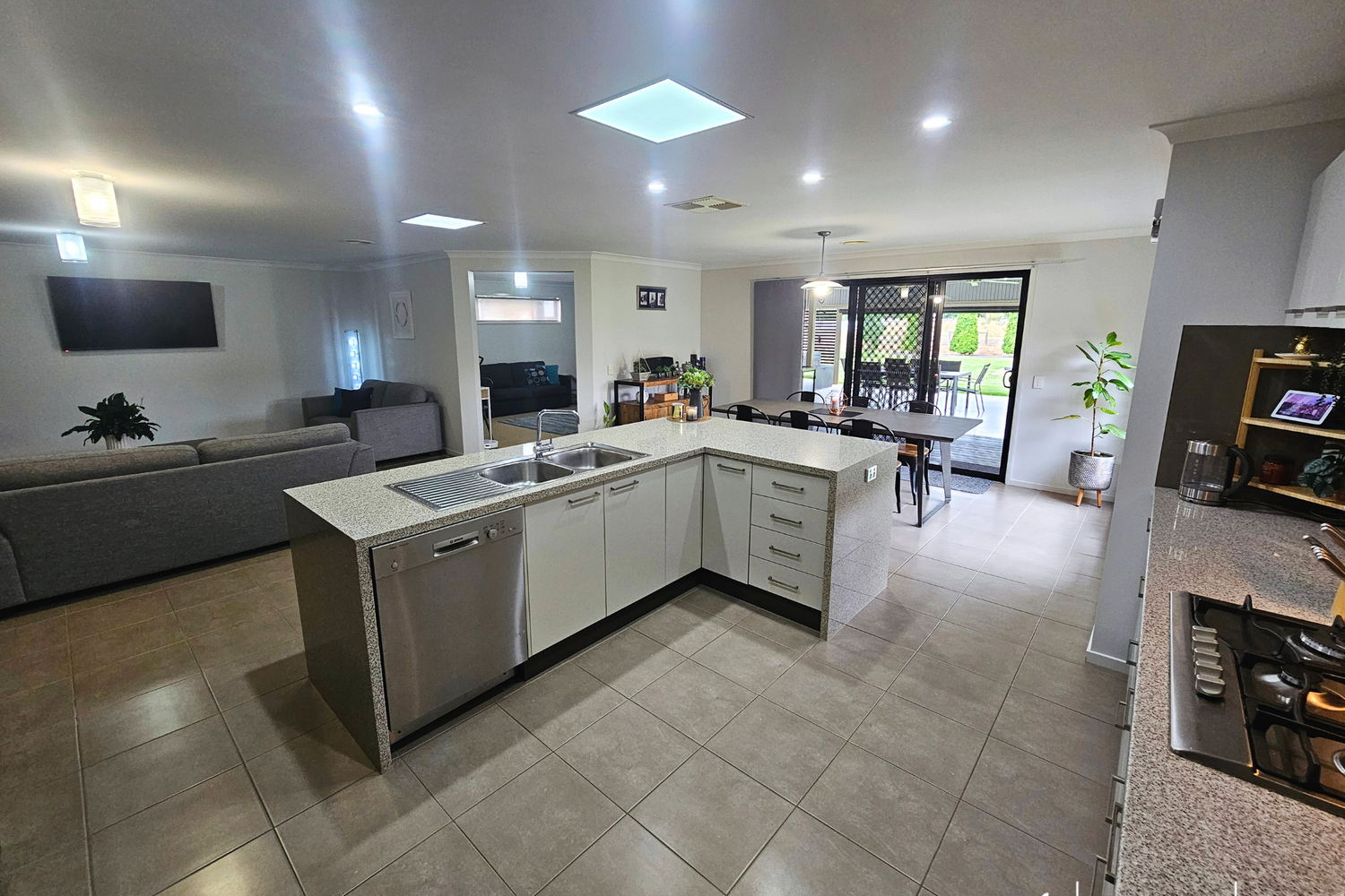 At the heart of this charming home is a modern kitchen, boasting sleek stone benchtops, perfect for the home chef. The kitchen seamlessly transitions into the living areas, creating an inclusive atmosphere for entertaining guests or relaxed family meals.