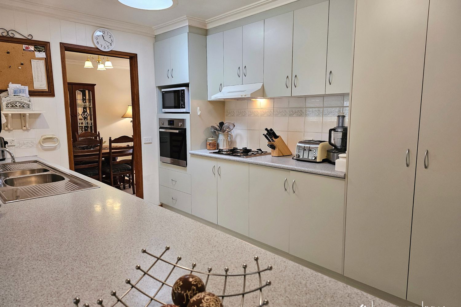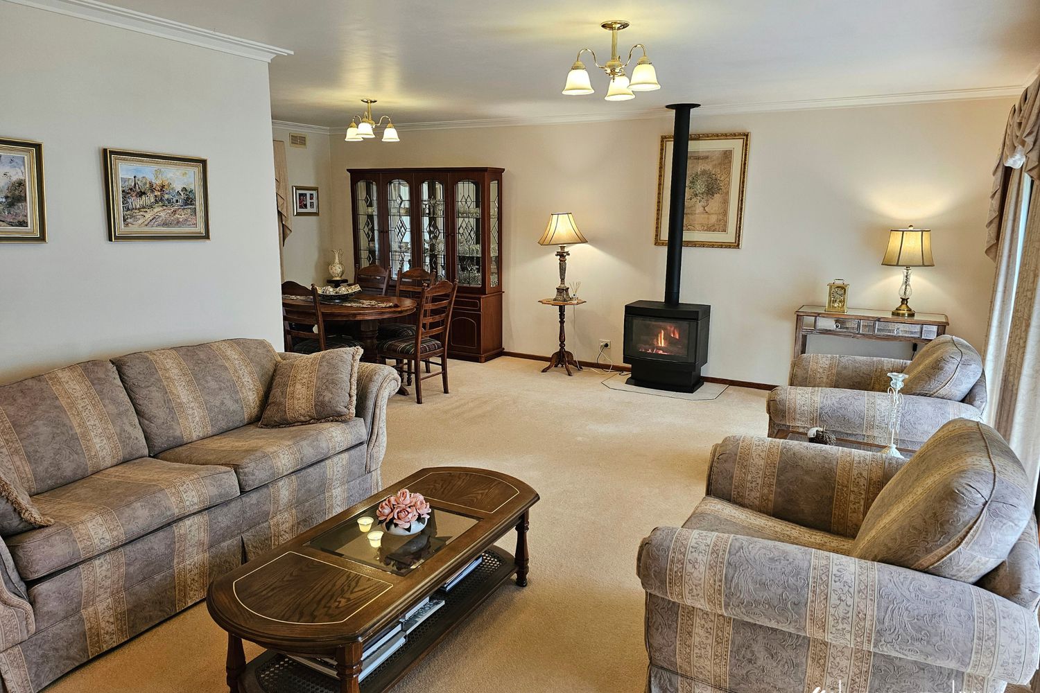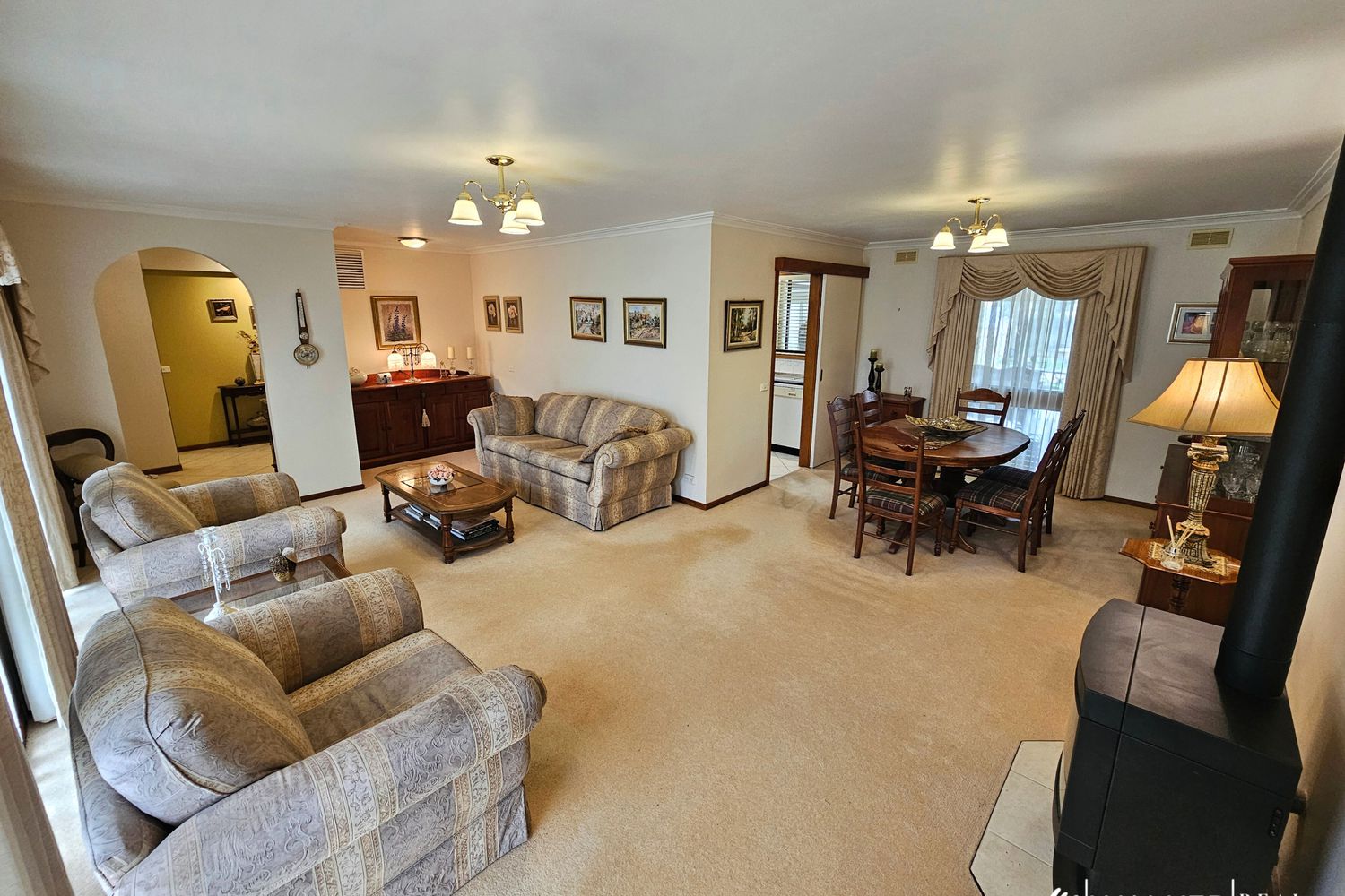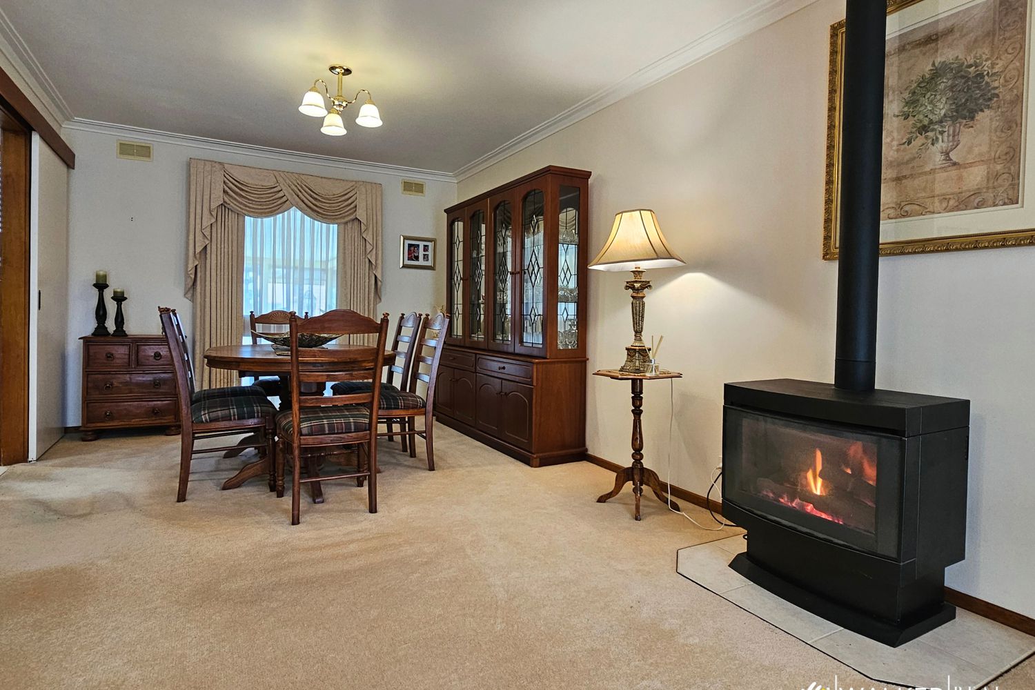 The heart of the home is the spacious L-shaped lounge, warmed by a cosy gas log fire, with multiple other heating and cooling options spread throughout including ducted evaporative cooling, split system reverse cycle and an additional gas heater, ensuring year-round comfort.