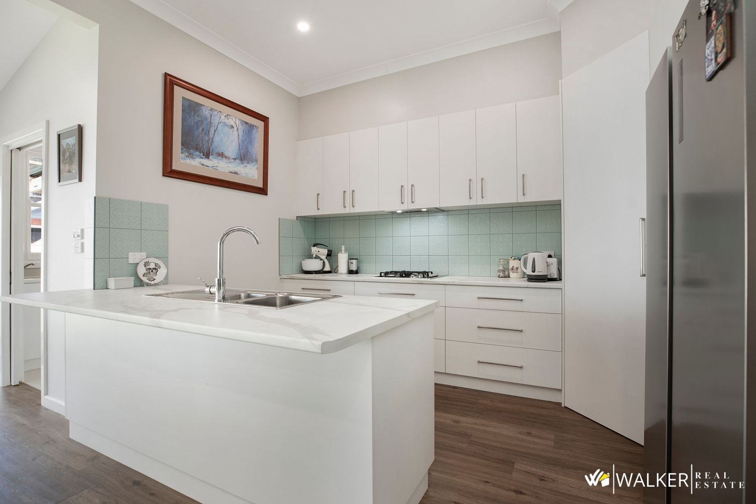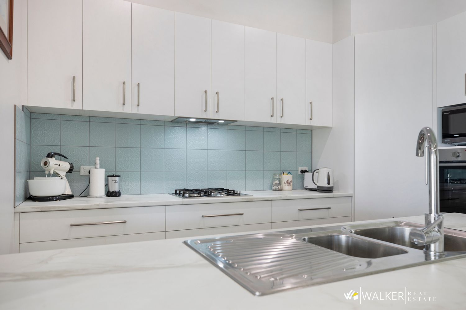 At the heart of the home is the light-filled open plan living, dining and kitchen zone — a space that truly brings people together. The stylish kitchen is both practical and striking, featuring quality appliances including a gas cooktop and electric oven, complemented by a beautifully detailed splashback that adds personality and flair.