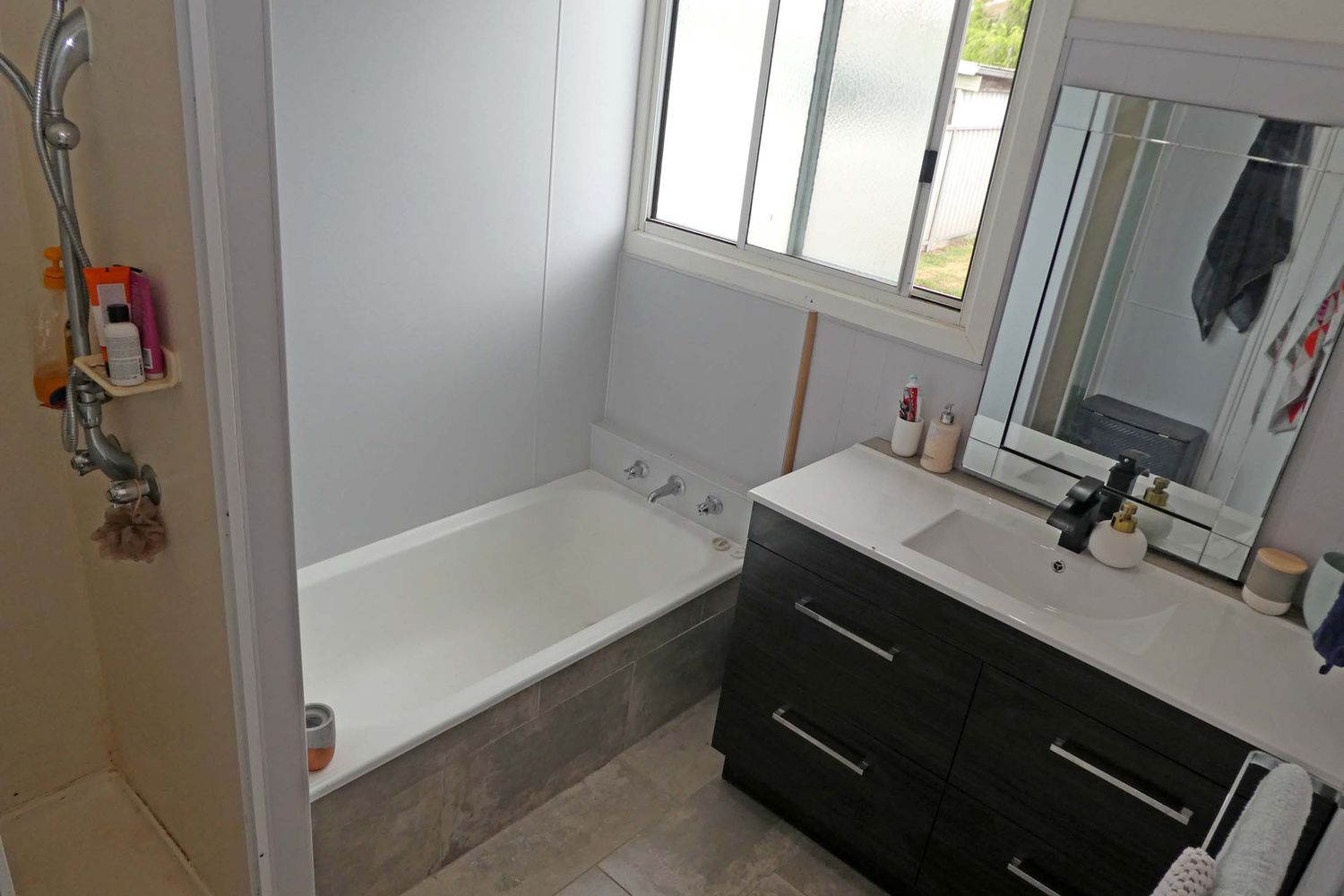 The bathroom features a modern vanity with bath and separate shower