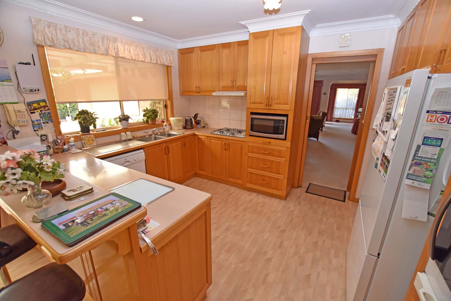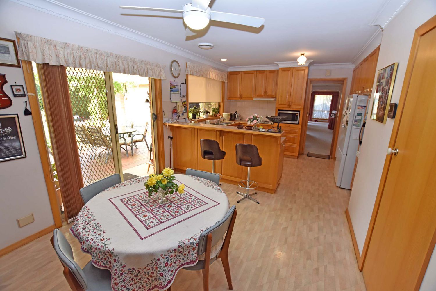 Offering open plan living with natural timber kitchen cupboards that overlooks an inviting pergola & courtyard area