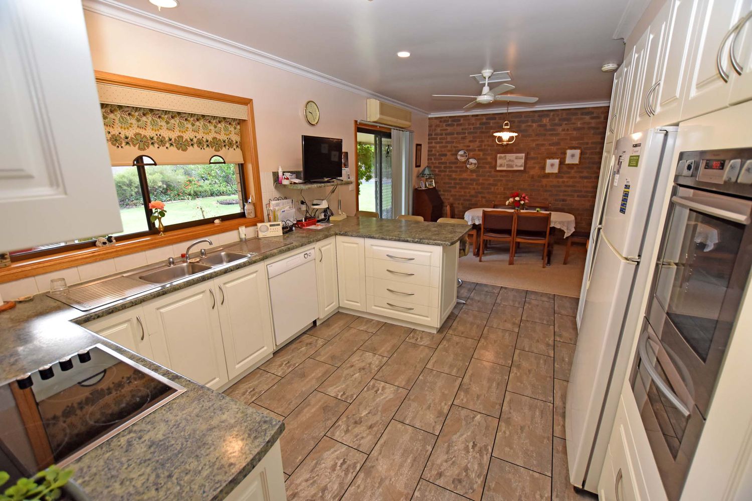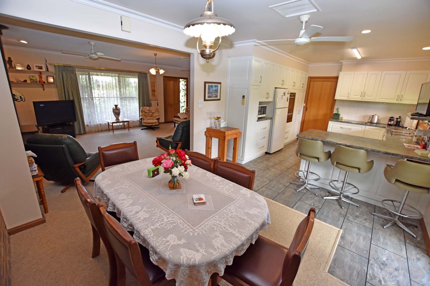 Offering open plan living area with lovely views of the rose garden while being comforted by a split system reverse cycle air conditioner or the wood heater