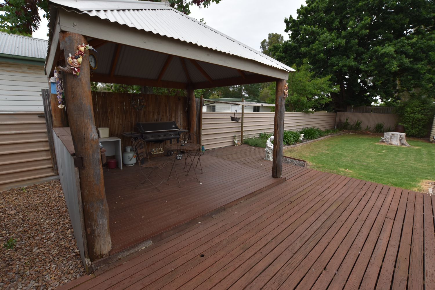 A decked area with pergola provides protection from the elements and overlooks an established leafy backyard
