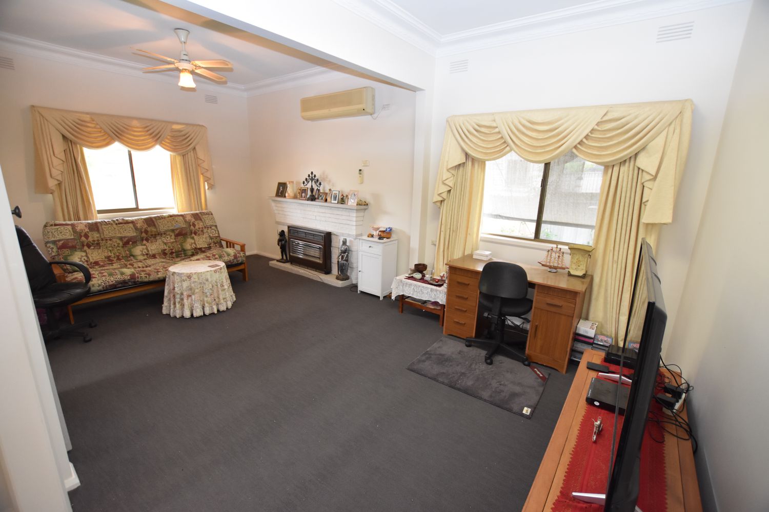Heating and cooling to the lounge is provided by a split system air conditioner and gas heater while a second air conditioner services the living room