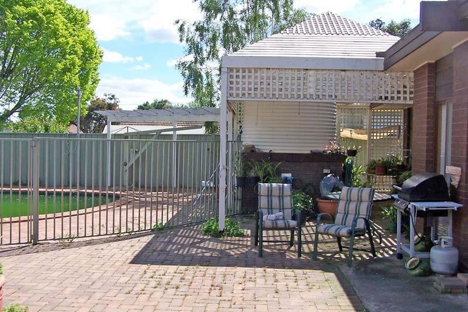 Outside boasts fully fenced solar heated inground pool, brick