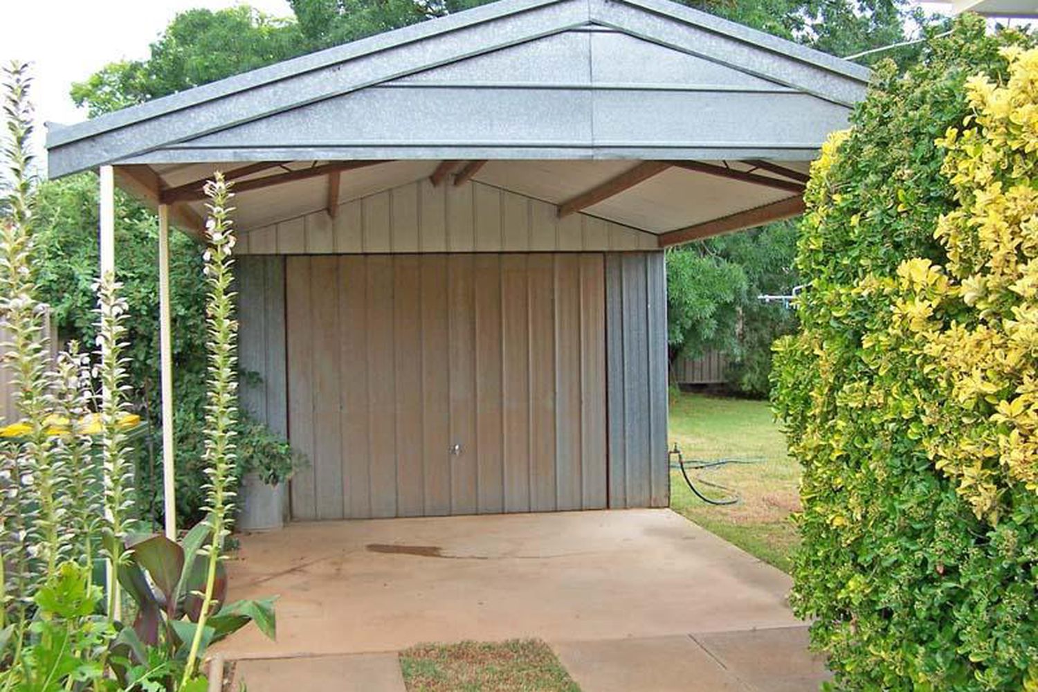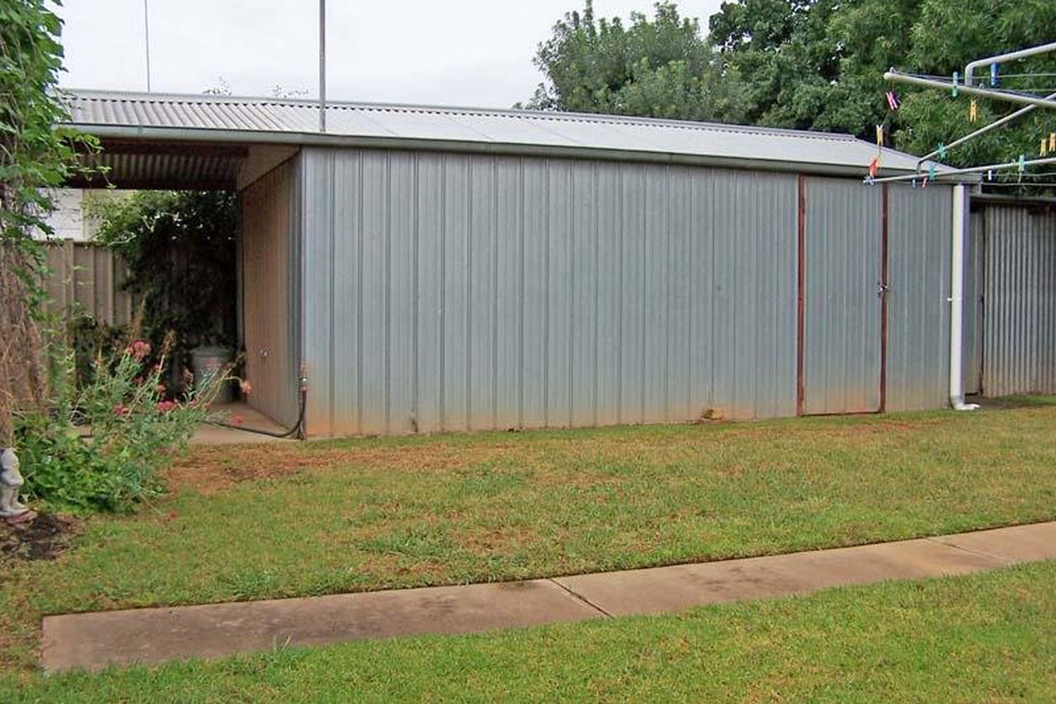 attaches storage/tool shed, back pergola, front auto watering system, secure & private fencing & aluminium security shutters to front windows.