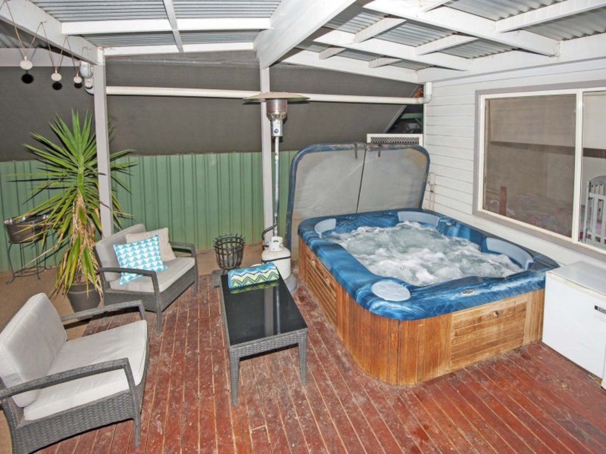 Double doors open onto the decked spa area that overlooks the newly constructed pergola ideal for outdoor entertaining
