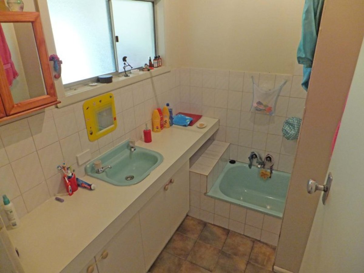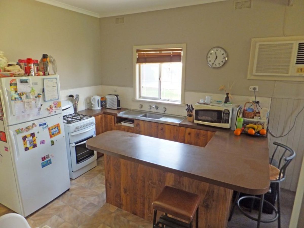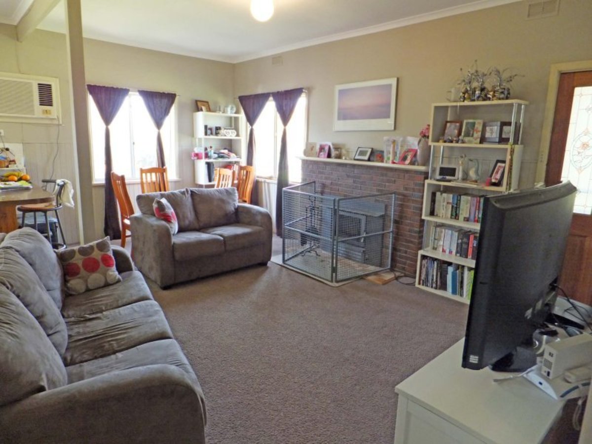 The comfortable 3 bedroom Fibro home has an open living area featuring a solid fuel heater and air conditioner