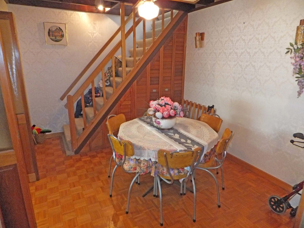 The dining area features exposed beams and parquetry flooring and open into the kitchen and lounge rooms