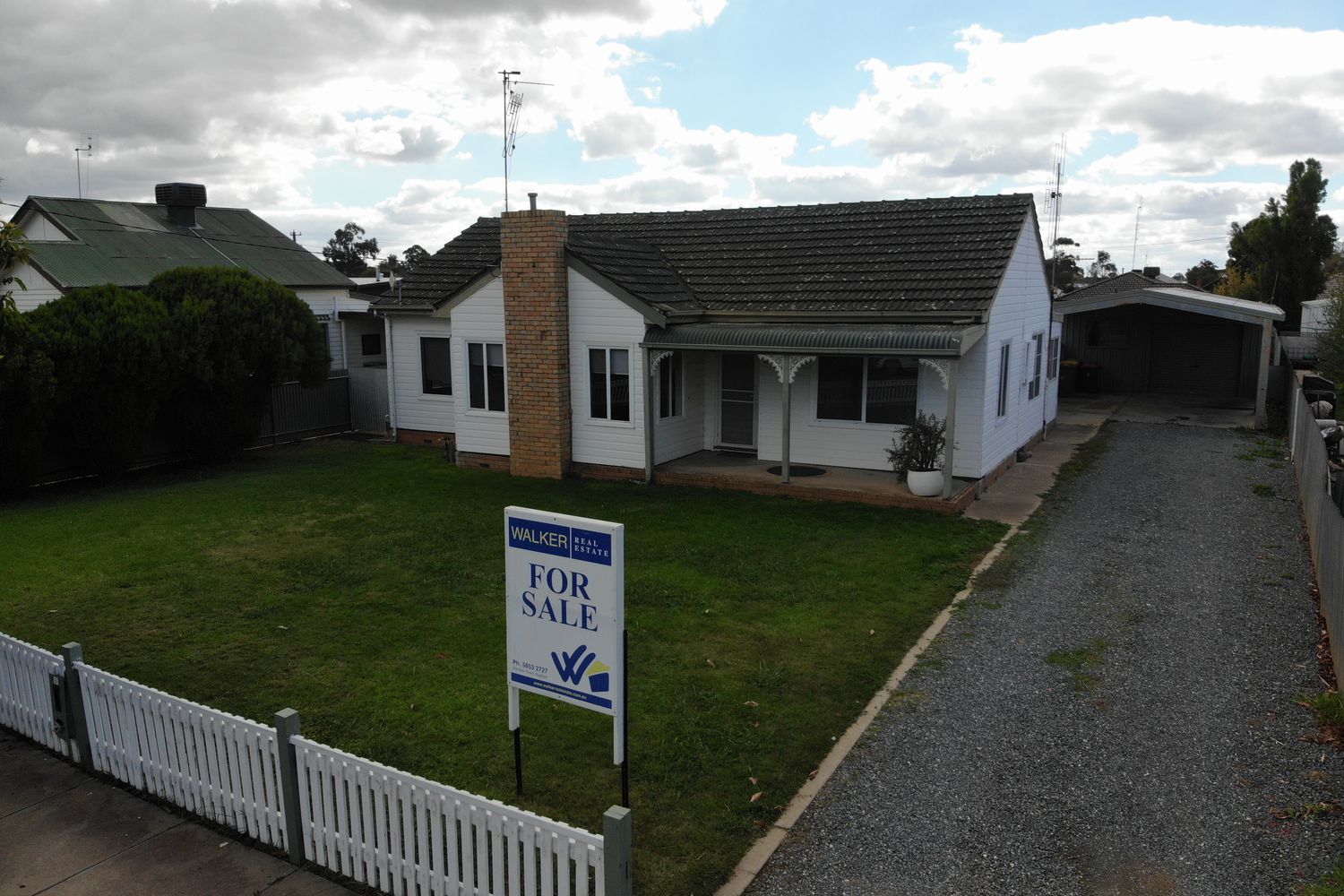 Neat low maintenance yard behind the cute picket fence