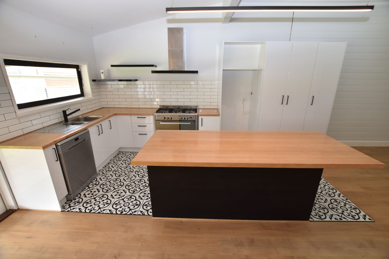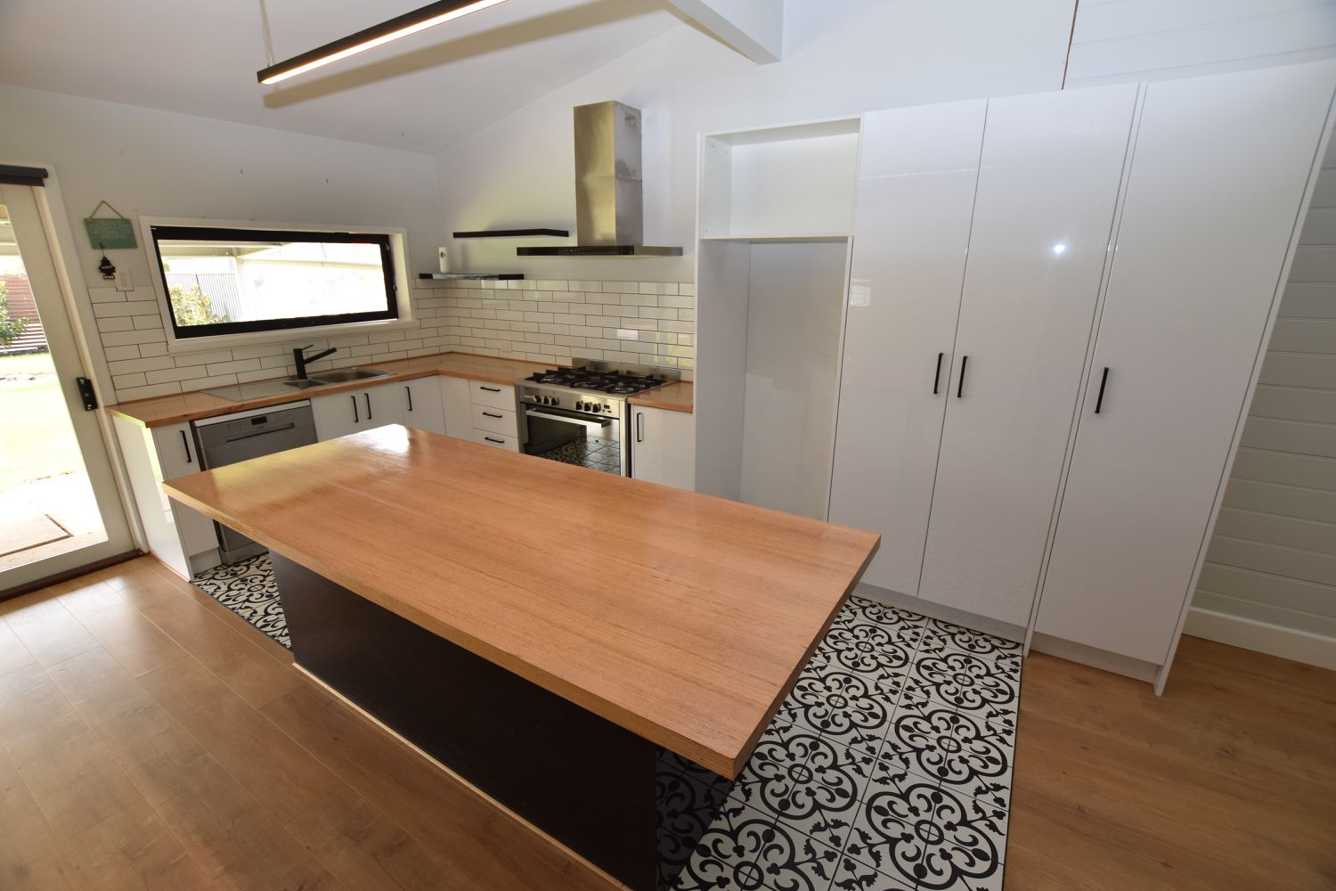 The open plan living with split system reverse cycle air conditioner and ducted evaporative cooling is complimented by a stunning kitchen you would be proud to entertain from